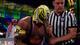 Angle tried to fight out but found himself again trapp ed in the grasp of his opponent's sleeper.
